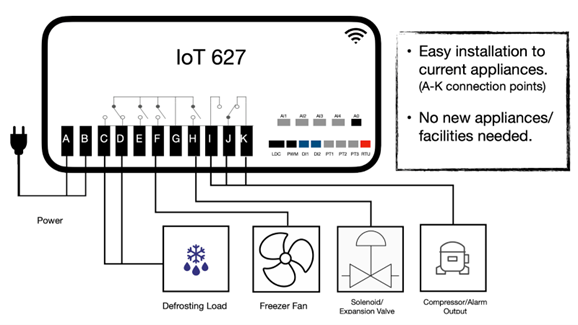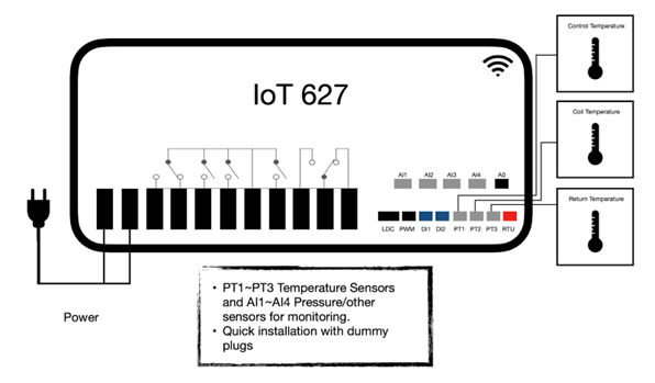 IoT 627 has installation connections that are categorized with system functions that are designed for quick installation.